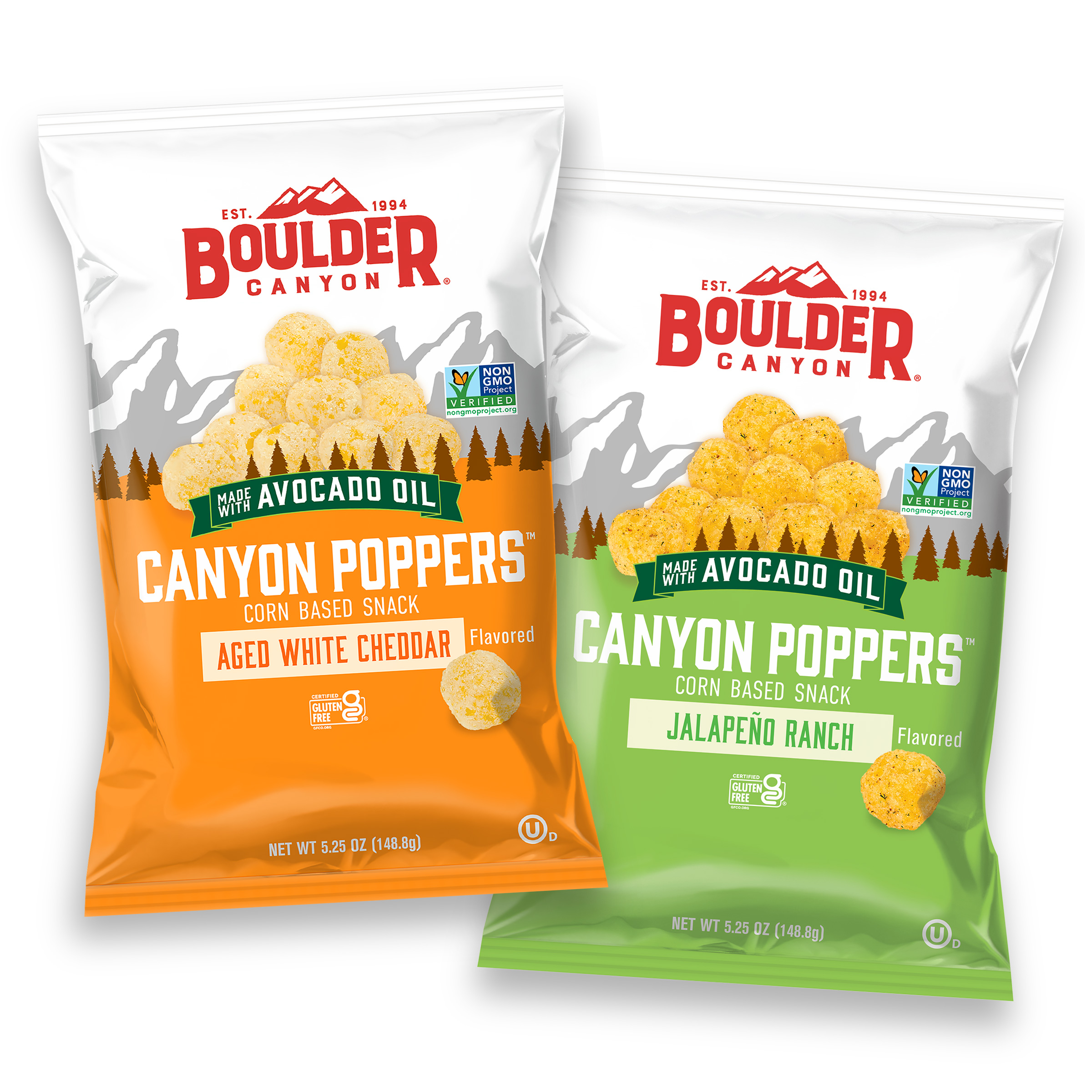 Keeping true to the simple, high-quality ingredients Boulder Canyon fans love, Canyon Poppers offers consumers a light, crispy, puffed snack choice. The perfectly crunchy corn-based snack comes in two flavors: Aged White Cheddar, featuring rich, cheesy taste, and Jalapeño Ranch, with tangy ranch flavor and a kick of spice. Canyon Poppers are made with avocado oil, certified gluten-free and Non-GMO Project Verified® ingredients.